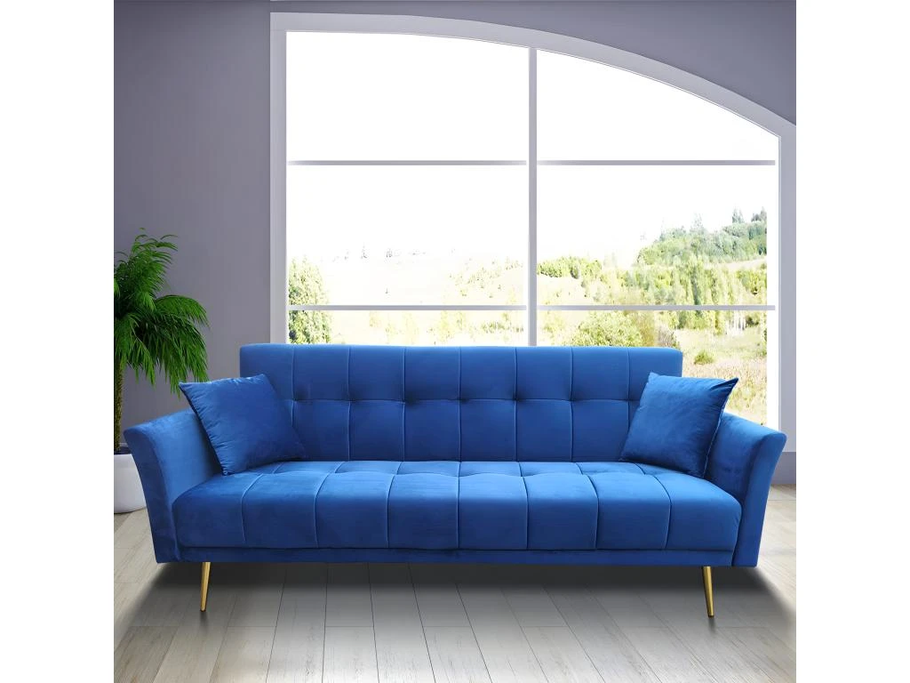 En velours bleu électrique, ce canapé 3 places est à la fois original et élégant. Ses lignes franches, son capitonnage et ses accoudoirs incurvés lui confèrent un esprit bourgeois. Le canapé RALPH est élégamment soutenu par de fins pieds inclinés en métal doré : le détail chic qui fait la différence ! Pratique, ce canapé est convertible, son dossier se couche pour vous offrir un couchage occasionnel. L’inclinaison de son dossier est facilement réglable, vous pourrez vous adosser pour bouquiner ou regarder votre série préférée !