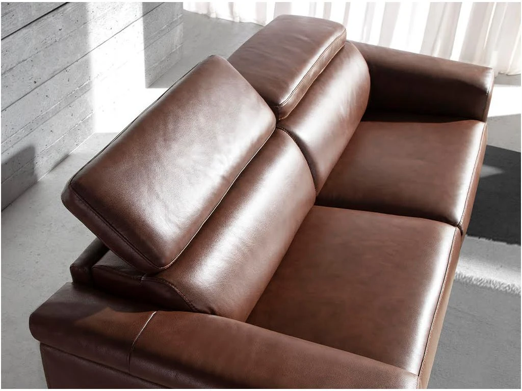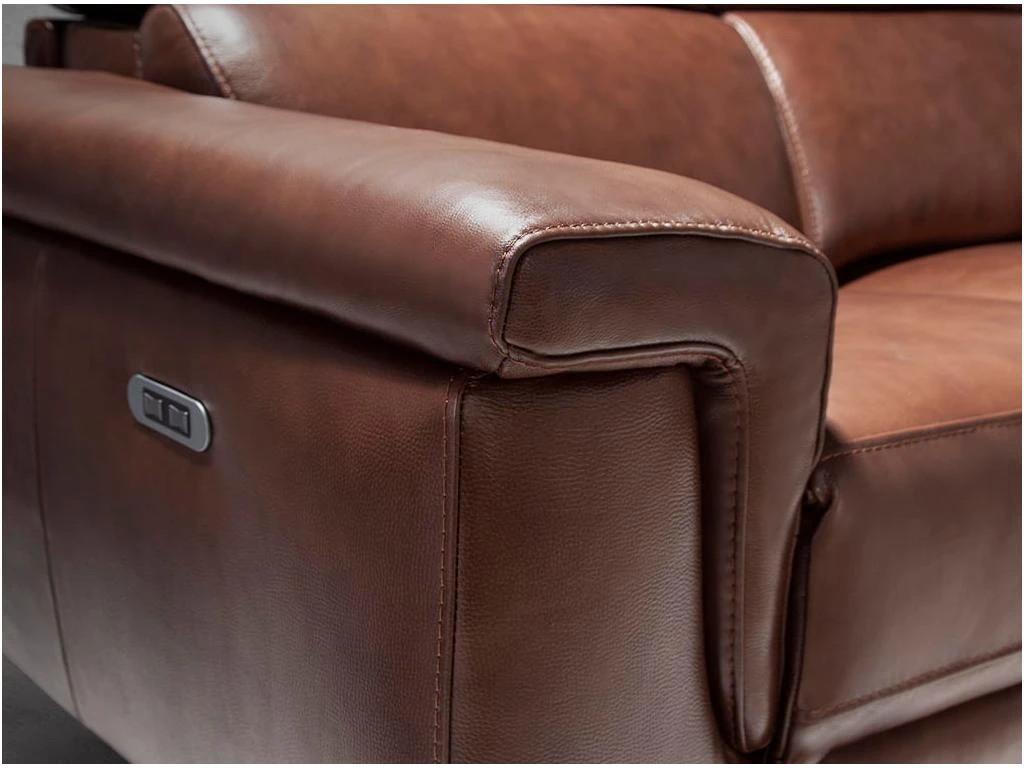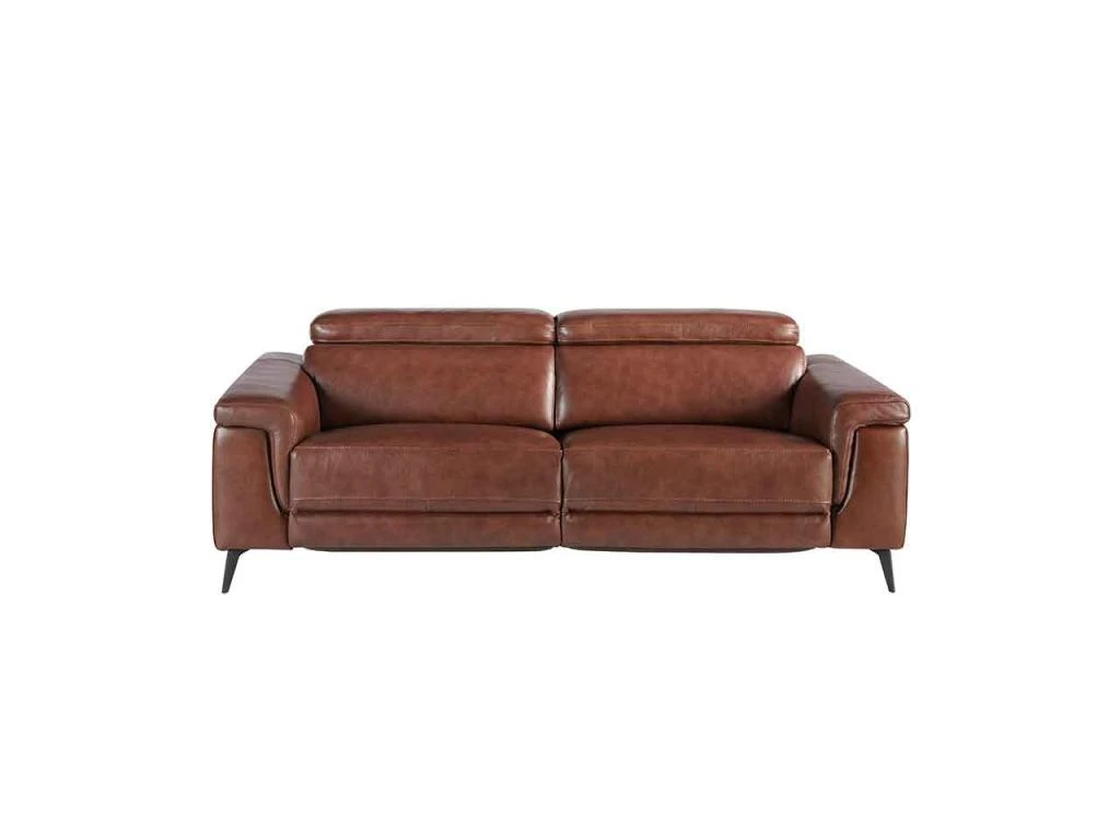Canapé 3 places au design moderne, tapissé de cuir de vachette marron cognac d’une épaisseur de 1 mm, avec accoudoirs et têtières indépendants et articulés. Un canapé de style avant-gardiste et moderne, avec une structure interne robuste en bois de pin naturel et des pieds en acier massif peints en époxy noir, ce qui lui donne la touche de tendance et d’élégance que vous recherchez pour votre salon. Son dossier et son assise en mousse de polyuréthane de 20 kg/m3, ainsi que ses deux mécanismes de relaxation électriques, lui confèrent le confort supplémentaire dont vous avez besoin pour vous détendre