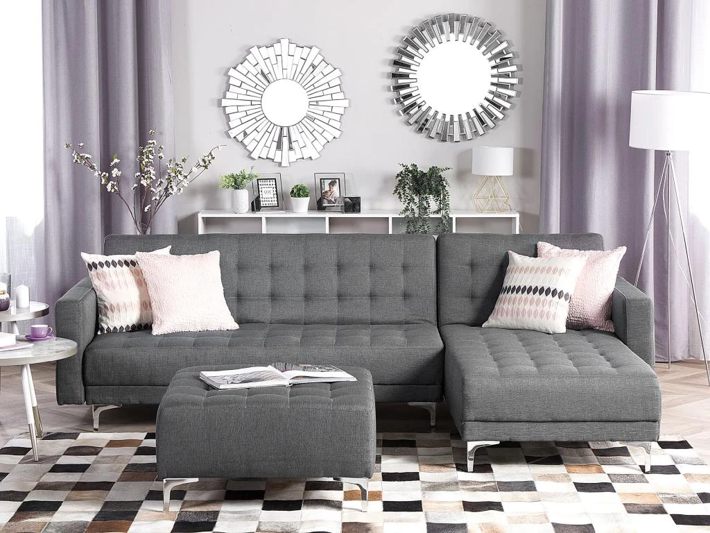 Canapé Angle Gauche Convertible En Tissu Gris Clair 4 Places Avec Pouf ABERDEEN