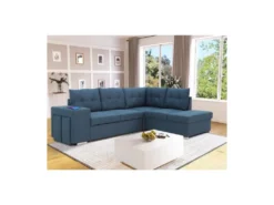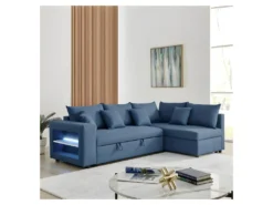Canapé D’angle Droite Convertible + Coffre De Rangement + 4 Coussins – Tissu Bleu – OWENS