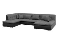Canapé D’angle Gauche Panoramique Convertible En Tissu Texturé Et Simili Gris Et Noir SONDRIO