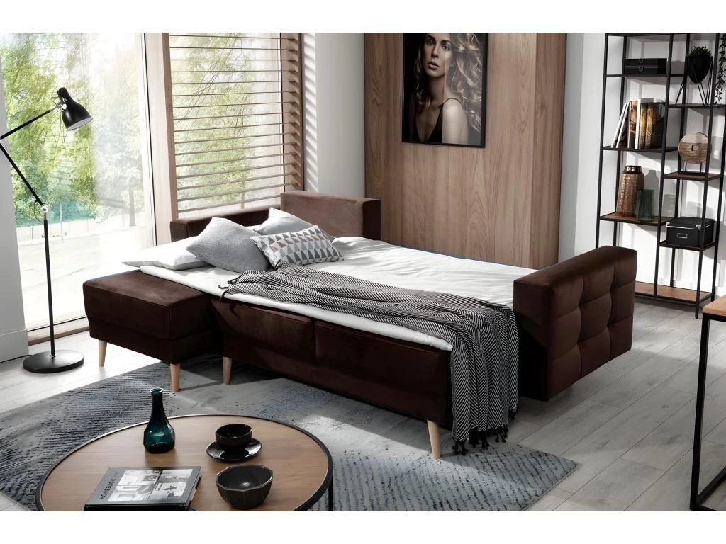 Le canapé ASSIA est très fonctionnel et mesure 250x162x87 cm. Il répondra aux attentes de détente jour et nuit. Il peut être transformé en lit facilement avec une surface de couchage de 120×210 cm, très pratique grâce au système d’ouverture très simple. Son assise très confortable notamment grâce aux ressorts continus doublés de mousse 30 kg/m3, contribue également à la qualité de sa structure et de son confort, offrant un soutien optimal du corps et un soulagement de la colonne vertébrale. Pour améliorer encore le niveau de confort, les dossiers profilés sont équipés d’un dossier rembourré et fixé par Velcro, cela vous permet de régler l’angle de courbure pour votre dos.
