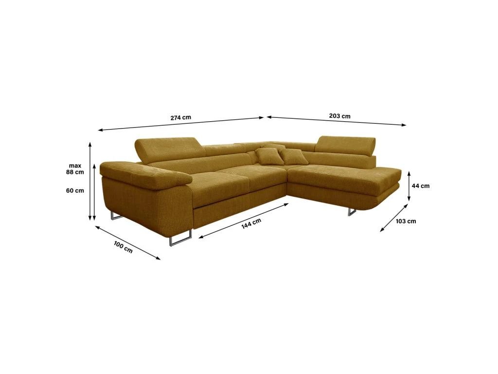 Dimensions : Canapé : 274 x 100 – 203 x 75 – 88 cm – Couchage : 198 x 125 cm – Hauteur assise : 44 cm – Hauteur accoudoir : 60 cm – Largeur méridienne : 103 cm