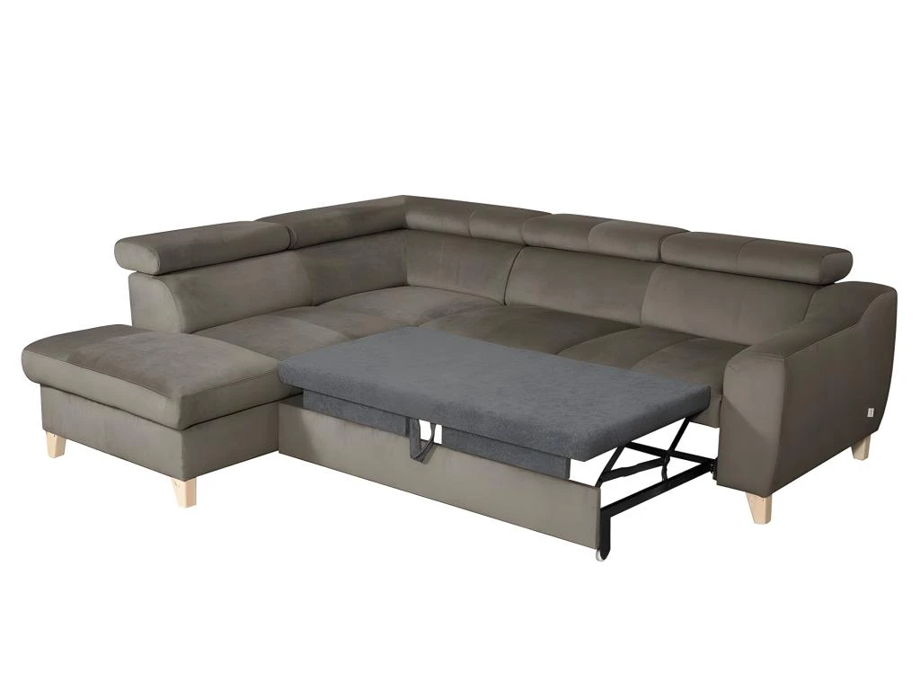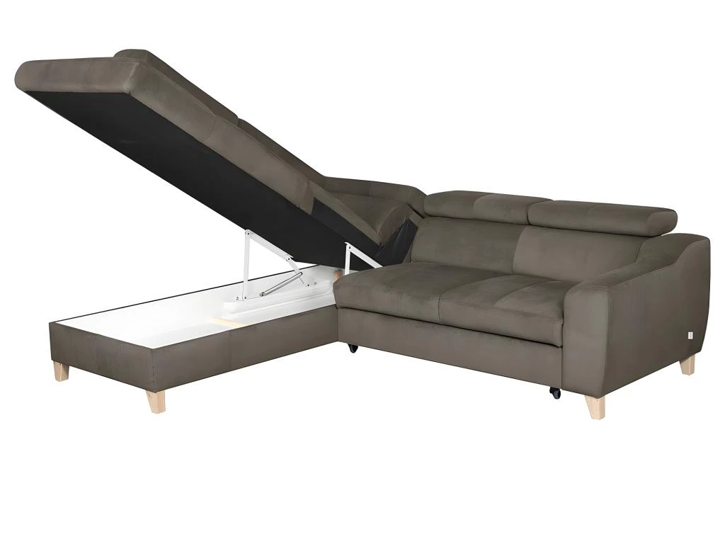 Voici un beau canapé convertible en tissu velours luxe. Un style contemporain, design et très épuré. Il offre un excellent confort. Avec sa belle méridienne confortable. Coffre de rangement. Tétières réglables multiposition. Très belle qualité de fabrication. Fabrication européenne.