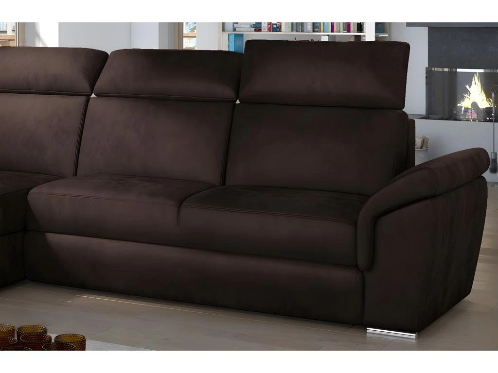 Très joli canapé d’angle convertible en tissu de catégorie luxe avec coffre, TRESOR. Style élégant et contemporain. Assises très confortables. Appui-têtes réglables. Belle qualité de fabrication européenne. Tissu haut de gamme facile à entretenir.