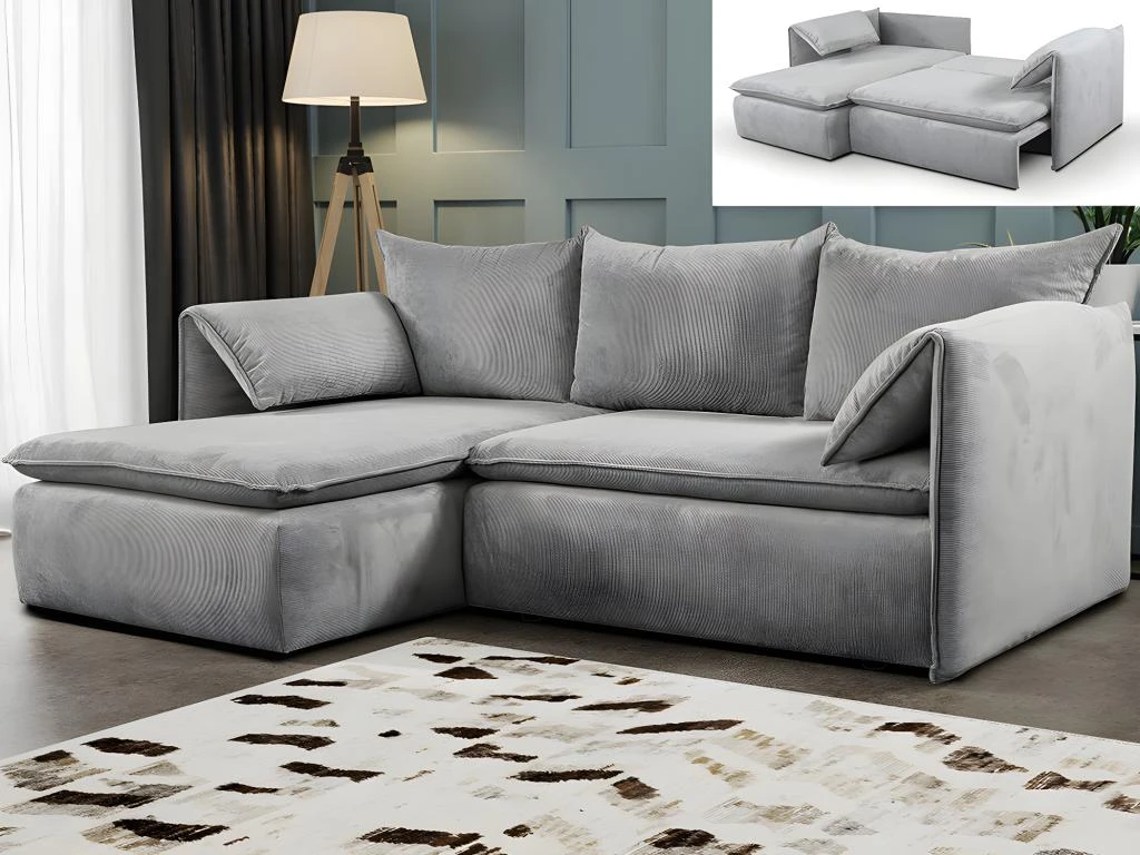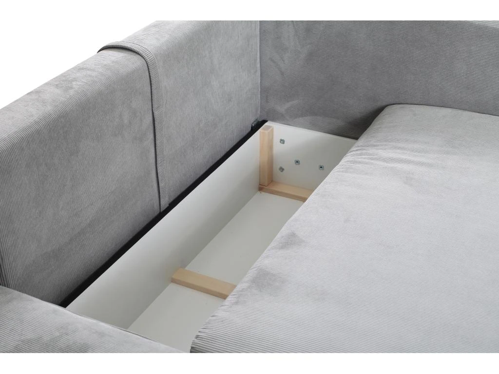 Idéal pour les petits espaces, le canapé d’angle convertible TEODORA deviendra rapidement une pièce maîtresse de votre salon grâce à la douceur de son velours côtelé, son look tendance souligné par ses accoudoirs fins relevables et à son aspect pratique. Vous allez adorer vous y prélasser ! Convertible et doté d’un coffre de rangement sous l’assise, ce modèle sera très utile au quotidien pour ranger draps, oreillers ou couettes.