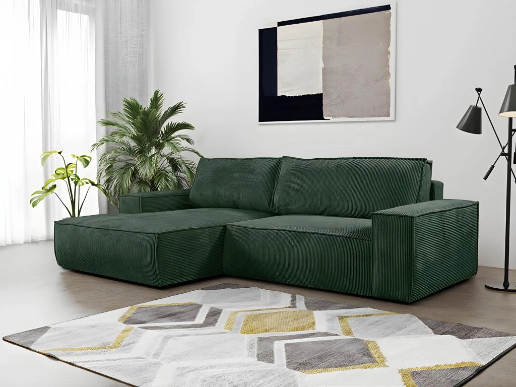 Le canapé d’angle convertible AMELIA en velours côtelé est la pièce qui viendra sublimer votre salon grâce à son élégance et à l’accueil doux et confortable qu’il vous offrira. Ce modèle est aussi très fonctionnel. Convertible et pratique, vous pourrez le transformer en un couchage supplémentaire très rapidement et aussi ranger vos affaires dans le coffre sous l’assise.