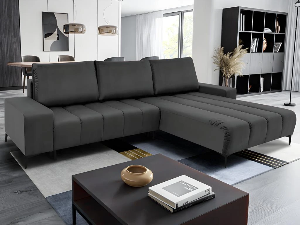 Vous avez envie d’un canapé convertible à la fois moderne et pratique ? Choisissez le canapé en velours DIALLA ! Son revêtement en velours et son assise matelassée font du canapé DIALLA un modèle moderne qui s’intégrera parfaitement dans tous types d’intérieurs. Grâce à son angle réversible, vous pouvez choisir facilement l’angle qui conviendra le mieux à votre salon. Avec son mécanisme convertible, transformez ce canapé en un couchage de manière simple et rapide. Profitez également de son coffre de rangement discret sous l’assise.