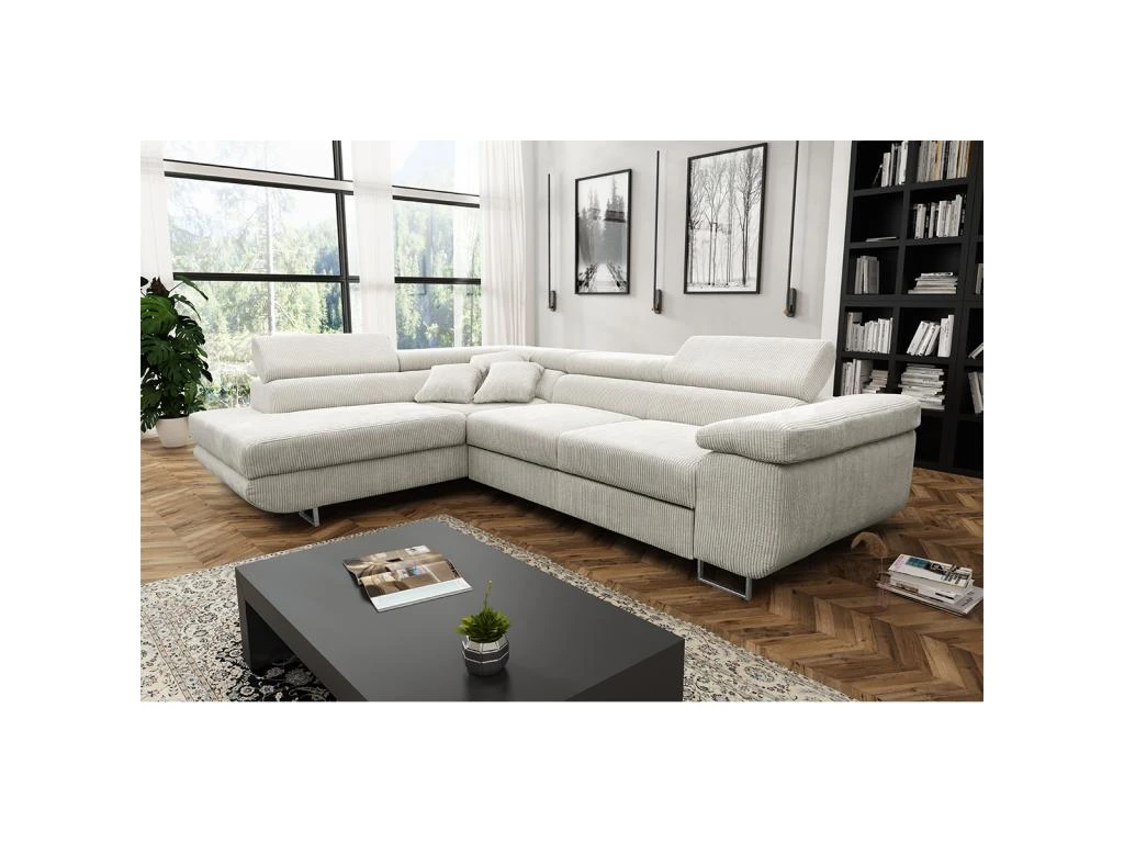 Caractéristiques : Canapé méridienne 4 places – Méridienne côté gauche – Appui-tête réglable en hauteur – Convertible en lit d’appoint – Système de dépliage avec tiroir sur roulette – Coffre de rangement sous la méridienne -Meridienne : mécanisme de verin avec amortisseur – 3 coussins décoratifs (45 x 45 cm) – Existe en 7 coloris