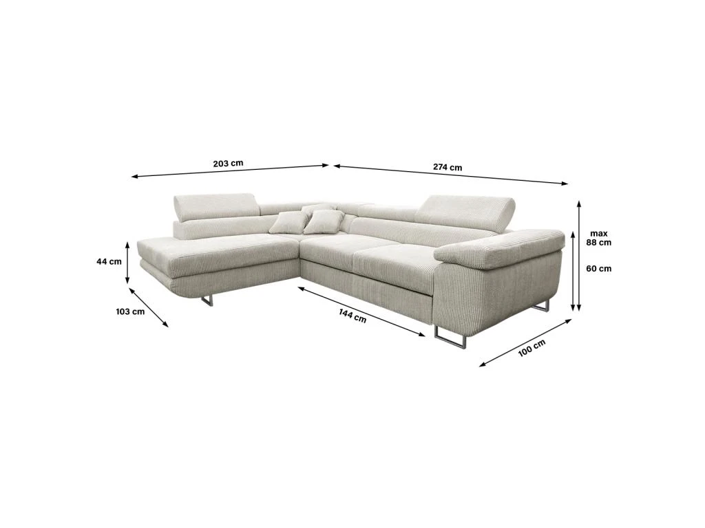 Dimensions : Canapé : 274 x 100 – 203 x 75 – 88 cm – Couchage : 198 x 125 cm – Hauteur assise : 44 cm – Hauteur accoudoir : 60 cm – Largeur méridienne : 103 cm