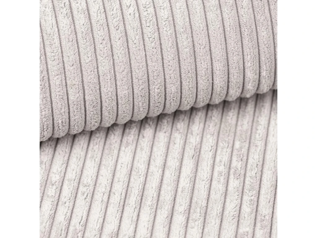 Matériaux : Revêtement : Tissu velours côtelé 100% Polyester – Rembourrage de l’assise : mousse T 28 épaisseur 11 cm et ressorts ondulés – Rembourrage du dossier : mousse T 25 épaisseur 8 cm – Piétement en métal chromé et ABS noir