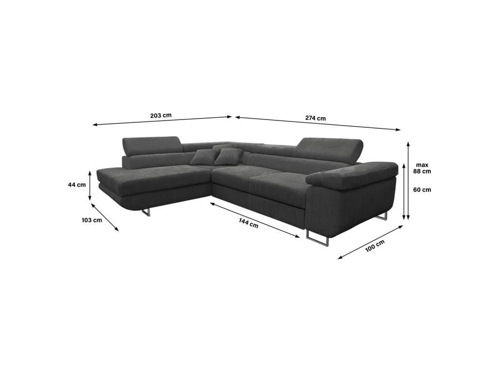 Dimensions : Canapé : 274 x 100 – 203 x 75 – 88 cm – Couchage : 198 x 125 cm – Hauteur assise : 44 cm – Hauteur accoudoir : 60 cm – Largeur méridienne : 103 cm
