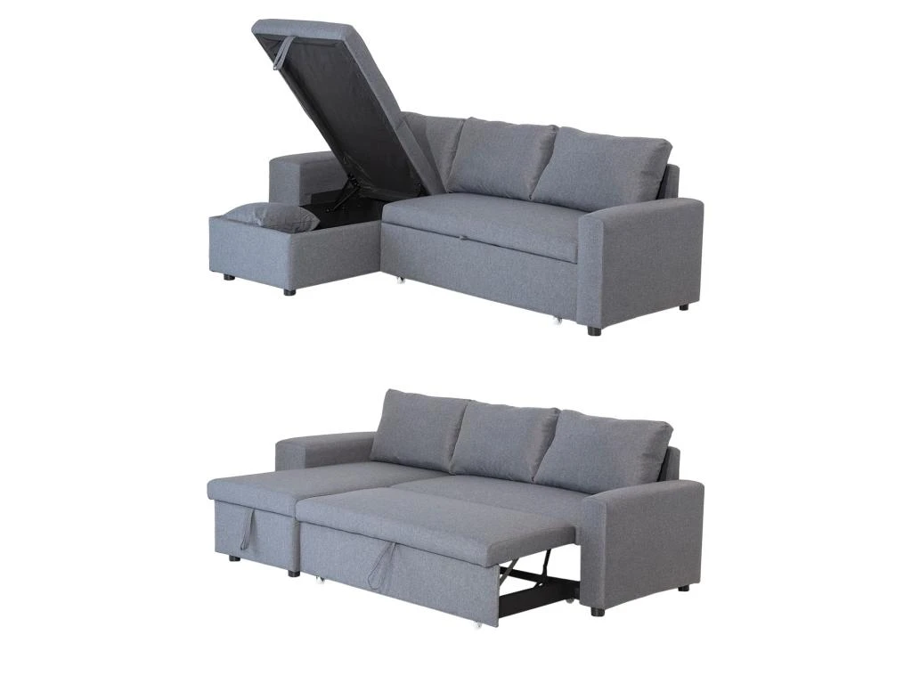 Optimisez votre espace avec le canapé d’angle convertible TONY. Sa méridienne réversible et ses poufs supplémentaires sous l’accoudoir vous permettront d’aménager facilement votre pièce. En un clin d’œil, vous passerez en mode nuit grâce à un système de tiroir simple qui transformera votre canapé en un couchage de deux personnes très confortable. Sous la méridienne se trouve un coffre spacieux qui vous permettra de ranger vos draps, oreillers et couettes. Le canapé convertible TONY est aussi confortable que tendance grâce à son design épuré et ses couleurs actuelles qui s’accorderont à toutes les décorations.