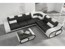 Canapé D’angle En Cuir Italien 7 Places LUXEMBOURG, Noir Et Blanc, Angle Droit