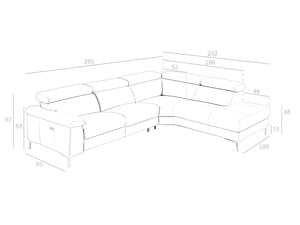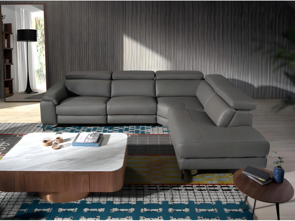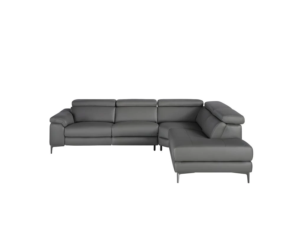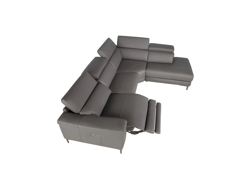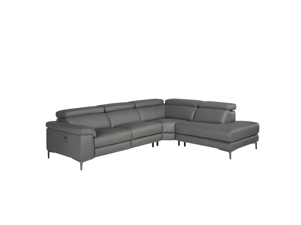 Canapé d’angle au design moderne tapissé en cuir de vachette de 1mm d’épaisseur couleur cuir gris avec appuis-tête indépendants réglables. Un canapé d’angle au style minimaliste et unique, avec une structure interne robuste en bois de pin naturel et des pieds en acier teinté époxy noir qui lui donnent cette touche de tendance et d’élégance que vous recherchez pour votre salon. Son siège latéral avec mécanisme de relaxation électrique vous offre le confort supplémentaire dont vous avez besoin pour profiter de votre moment de tranquillité. La combinaison parfaite de design, d’élégance et de confort
