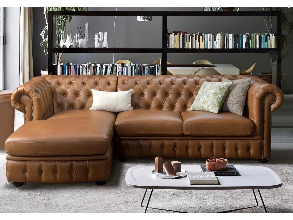 À la recherche d’un canapé d’angle alliant tendance, intemporalité et haute qualité ? Découvrez le canapé d’angle Chesterfield BRENTON. Avec son aspect vieilli, son effet capitonné et ses accoudoirs cloutés au style industriel, ce modèle est à la fois tendance et intemporel. Fabriqué en cuir de buffle pleine fleur, il offre à la fois douceur et durabilité, s’accordant parfaitement avec des intérieurs modernes et élégant !