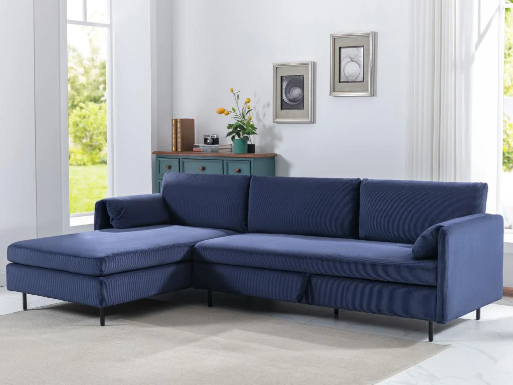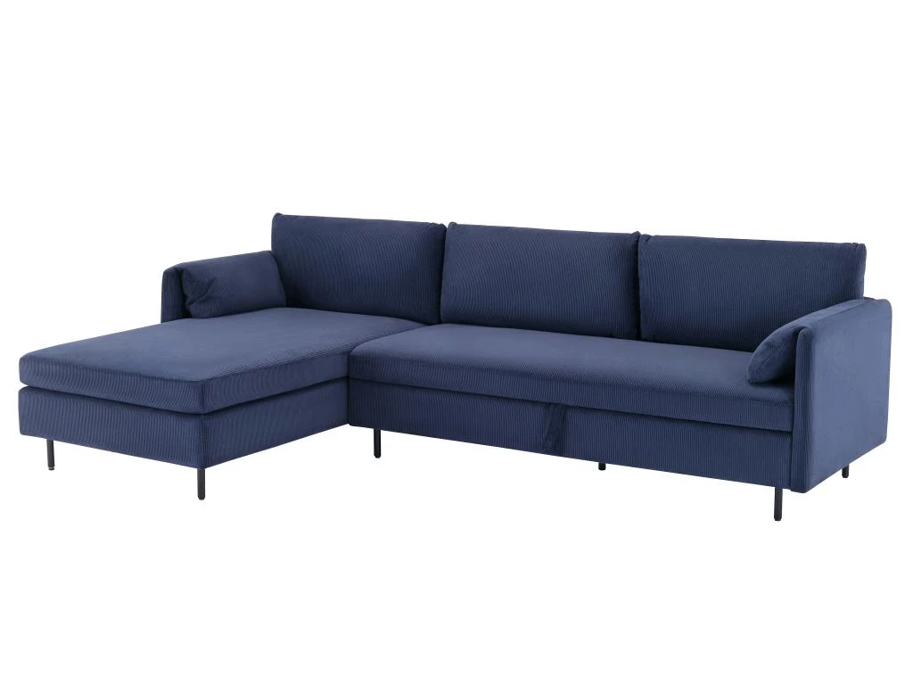 Vous recherchez un canapé au style contemporain ? Optez pour le canapé d’angle ALEXANDRA ! Son revêtement en velours côtelé doux et coloré apportera une touche de lumière à votre salon et sera l’allié de vos moments de détente ! Ses pieds en métal ajoutent une finition moderne au canapé tandis que son mécanisme convertible vous offrira un couchage de manière simple et rapide.