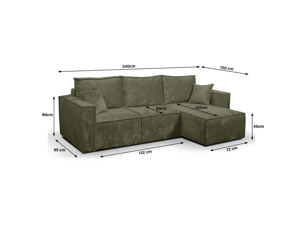 Dimensions : Canapé : 240 x 95 – 150 x 72 cm – Couchage : 200 x 135 cm – Hauteur d’assise : 40 cm – Hauteur accoudoir : 60 cm – Largeur méridienne : 72 cm