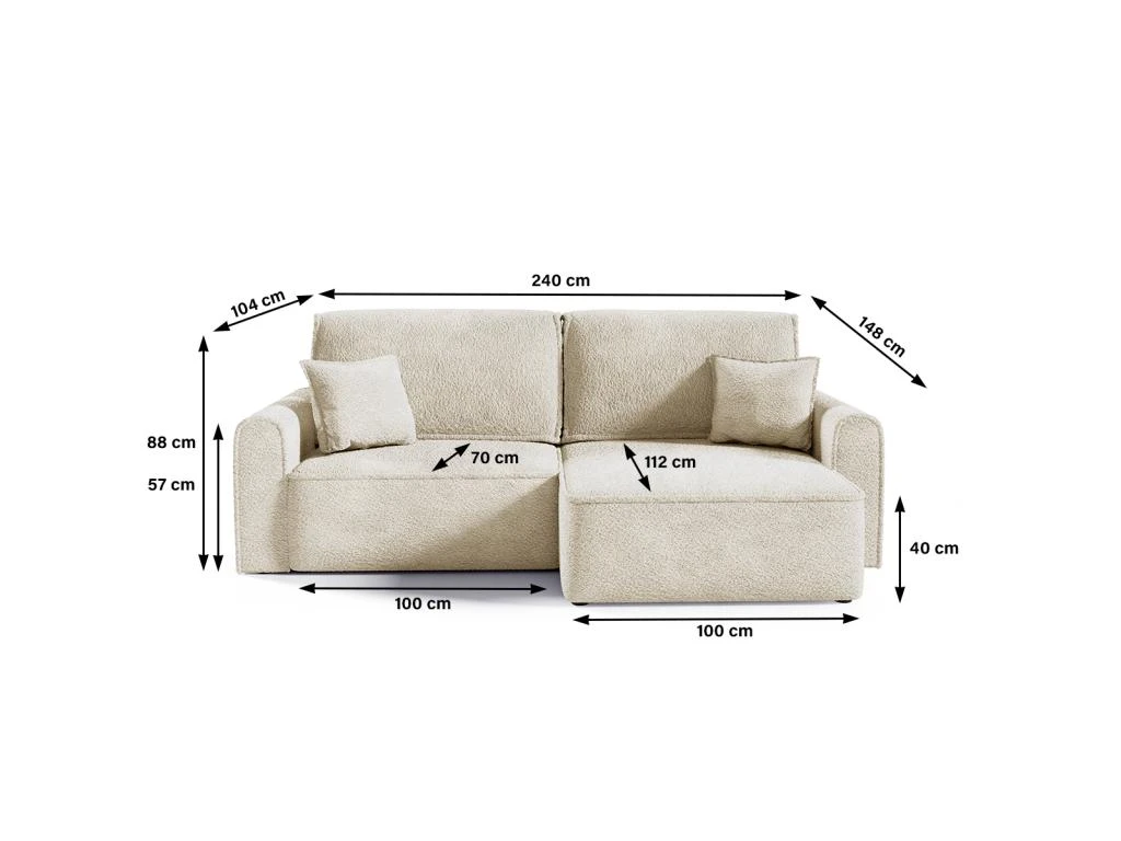 Dimensions : Canapé : 240 x 104 – 148 x 88 cm – Couchage : 200 x 135 cm – Hauteur d’assise : 38 cm – Hauteur accoudoir : 57 cm – Largeur méridienne : 100 cm