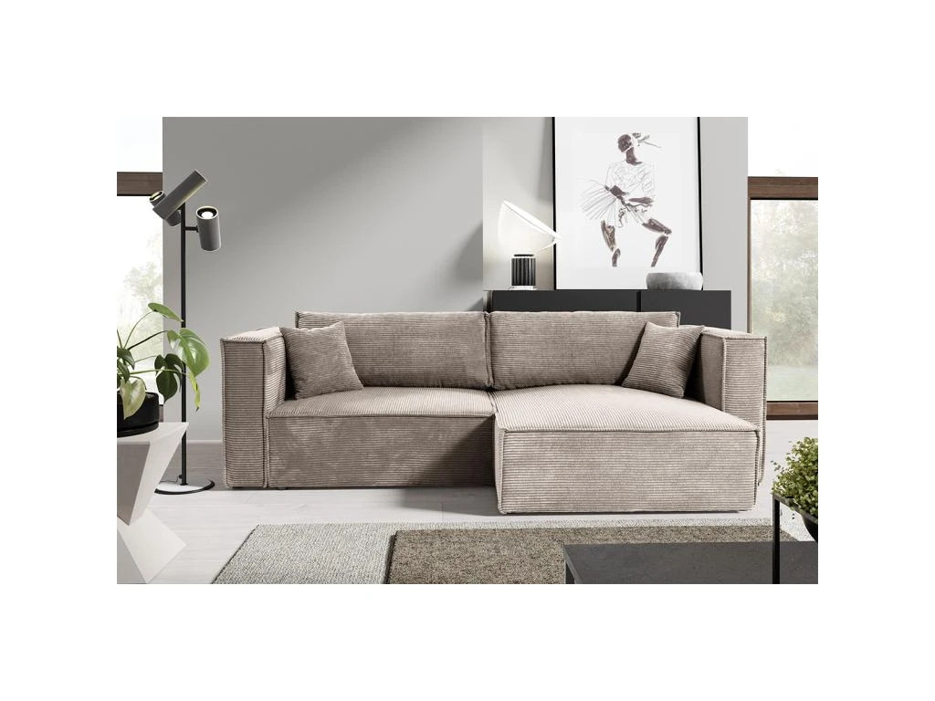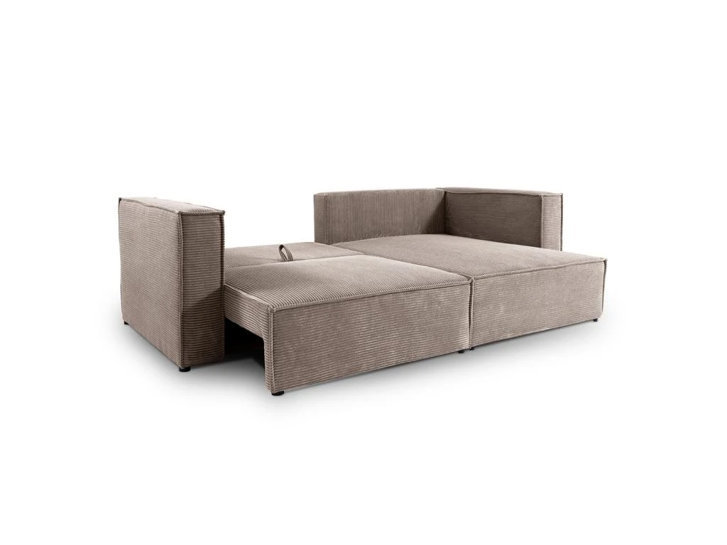 Matériaux : Tissu velours côtelé 100% Polyester – Rembourrage de l’assise : mousse de polyuréthane T28 épaisseur 11 cm et ressorts ondulés – Rembourrage du dossier : mousse T25 épaisseur 8 cm – Piétement ABS noir