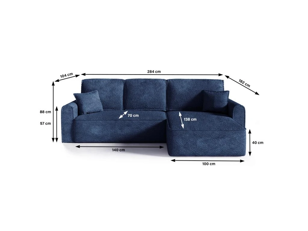 Dimensions : Canapé : 284 x 104 – 182 x 88 cm – Couchage : 244 x 140 cm – Hauteur d’assise : 40 cm – Hauteur accoudoir : 57 cm – Largeur méridienne : 102 cm