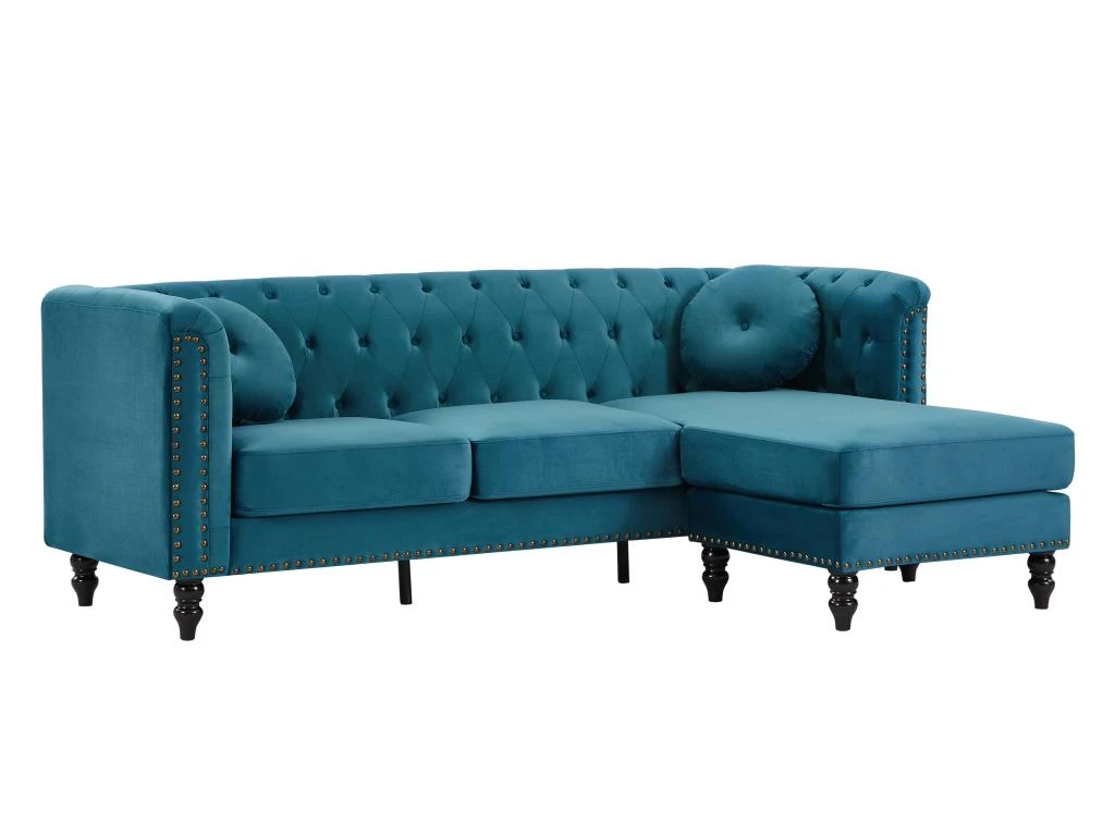 Envie d’une ambiance chaleureuse et vintage dans votre salon ? Le canapé TURNER sera votre canapé idéal. Inspiré du modèle mythique chesterfield, il apportera une touche vintage à votre intérieur. Son revêtement en velours ainsi que sa finition cloutée font de lui un canapé glamour qui donnera de la douceur et du cachet à votre pièce. Pratique grâce à son angle réversible, vous pourrez choisir l’angle qui convient le mieux à votre salon en un clin d’œil.