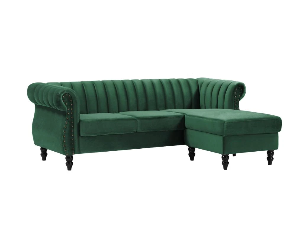 Vous désirez un canapé qui allie charme et élégance ? Optez pour le canapé d’angle TRUMBO ! Sa finition cloutée sur les accoudoirs ainsi que son dossier matelassé apportent une note d’originalité au canapé. Grâce à son angle réversible, vous pourrez choisir l’angle qui vous convient le mieux en fonction de vos envies du moment. Son revêtement en velours vous garantira une douceur maximale.
