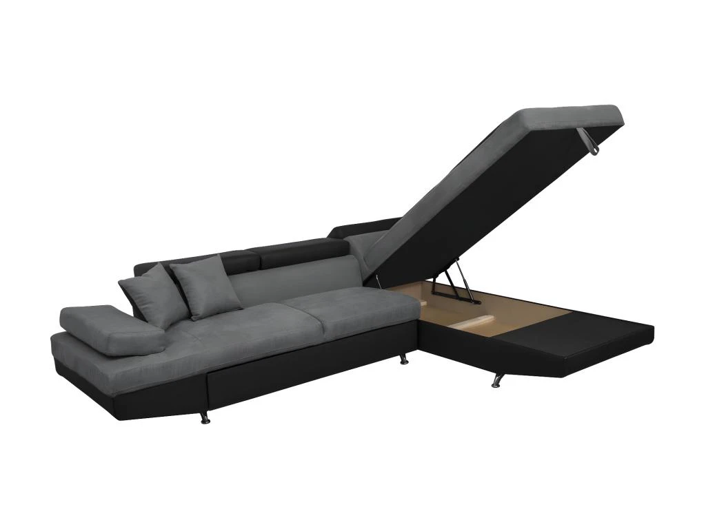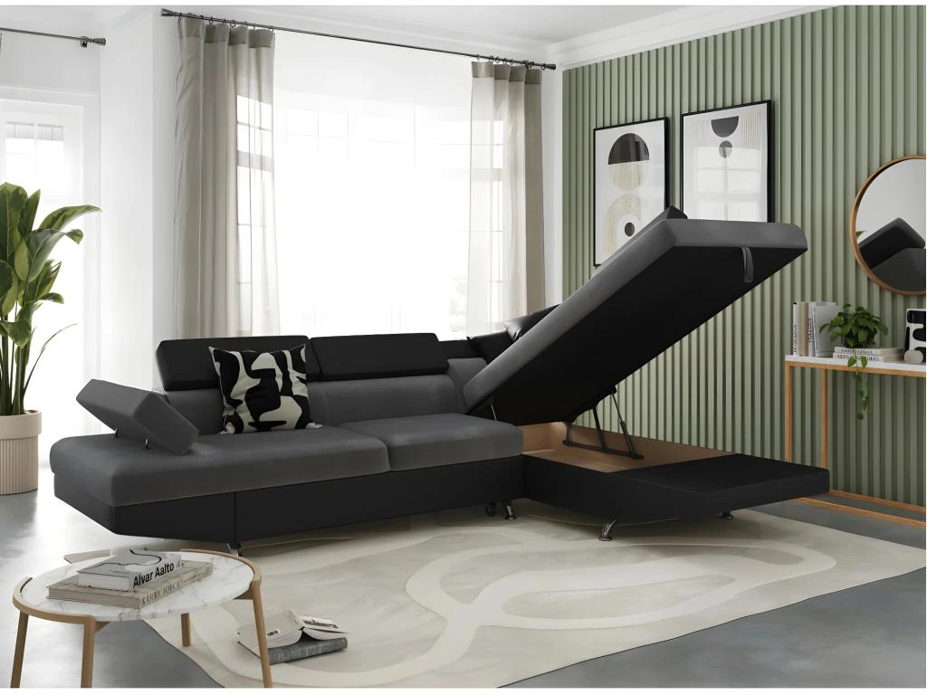 La large méridienne du canapé d’angle RIO offre un espace de détente idéal pour des moments agréables devant un bon film ou un livre. De conception astucieuse, RIO abrite un grand coffre de rangement sous sa méridienne. Très pratique, vous pourrez y loger des plaids, des couvertures, des livres, etc., ce qui vous apportera un gain de place considérable. l’angle de ce canapé convertible design 5 places n’est pas réversible. RIO doit donc être choisi en fonction de son angle fixe, droit ou gauche, pour s’accommoder parfaitement à votre intérieur. La structure du canapé est composée des matériaux suivants : bois, MDF, aggloméré et métal. Son assise, constituée de mousse et de ressorts en zig-zag, offre une bonne répartition du poids.