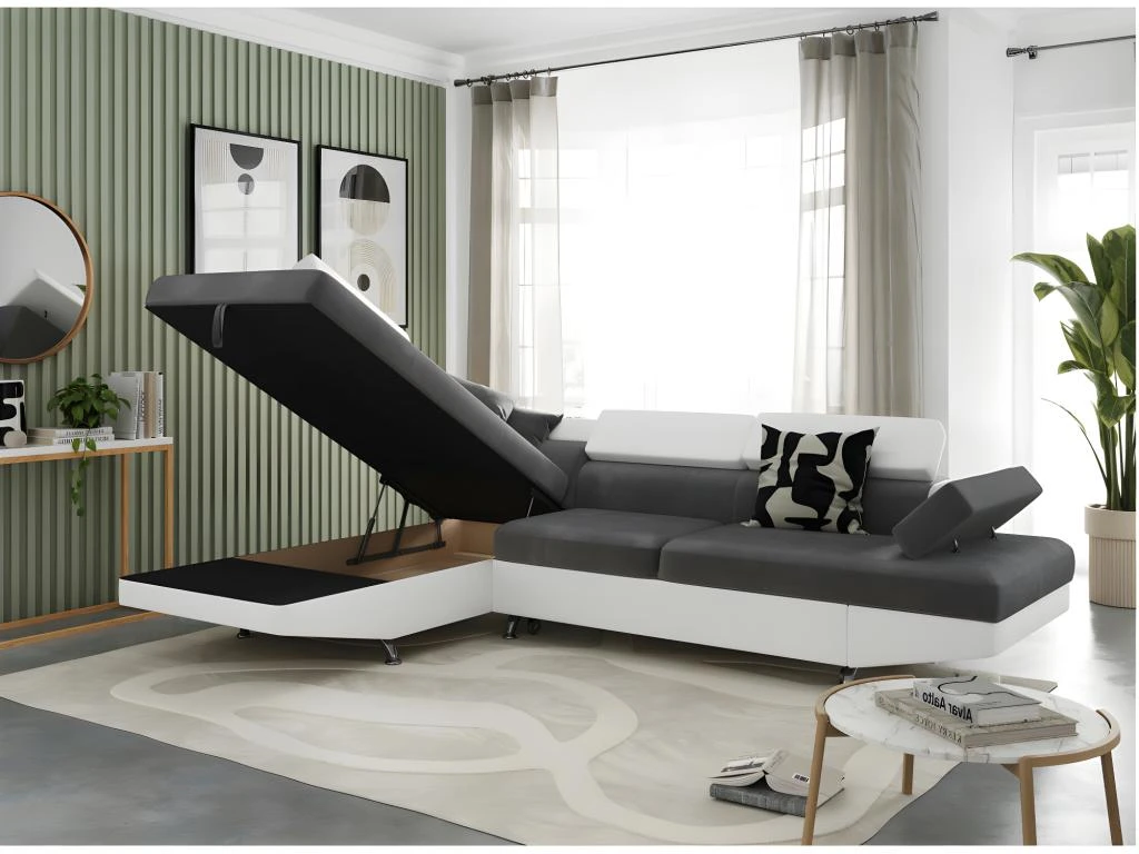 La large méridienne du canapé d’angle RIO offre un espace de détente idéal pour des moments agréables devant un bon film ou un livre. De conception astucieuse, RIO abrite un grand coffre de rangement sous sa méridienne. Très pratique, vous pourrez y loger des plaids, des couvertures, des livres, etc., ce qui vous apportera un gain de place considérable. l’angle de ce canapé convertible design 5 places n’est pas réversible. RIO doit donc être choisi en fonction de son angle fixe, droit ou gauche, pour s’accommoder parfaitement à votre intérieur. La structure du canapé est composée des matériaux suivants : bois, MDF, aggloméré et métal. Son assise, constituée de mousse et de ressorts en zig-zag, offre une bonne répartition du poids.