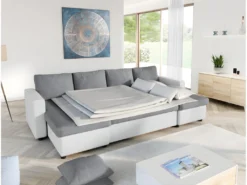 Canapé D’angle Panoramique Convertible LEMON Gris Et Blanc. Avec Lit
