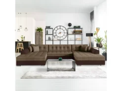 Canapé Panoramique D’angle Convertible Vento Simili Marron Et Tissu Marron