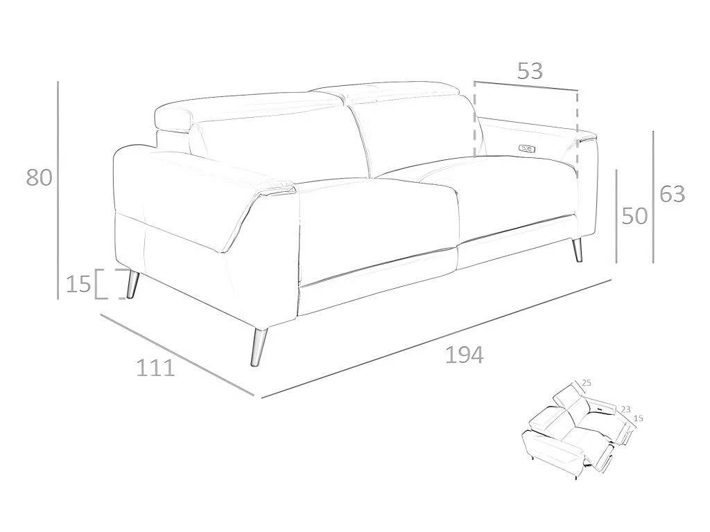 - CARACTÉRISTIQUES:Nombre de sièges : 3 Coussins séparés : Non. Coussins amovibles : Non. Appuis-tête réglables : Oui, en position avec le système manuel. Mécanisme de relaxation : Oui, 2 sièges avec système de mécanisme de relaxation électrique. Accessoires : port USB