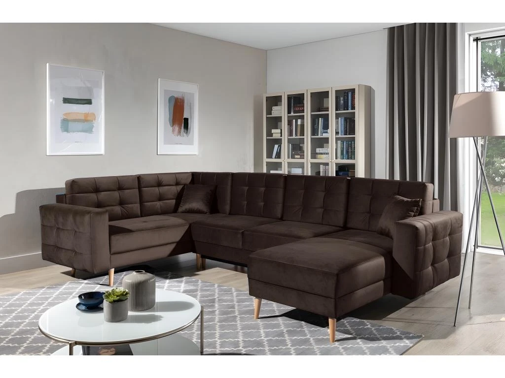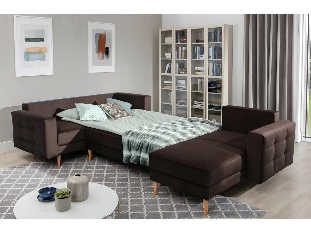 La disposition en forme de U panoramique offre beaucoup d’espace pour se détendre, car le canapé mesure 320x202x90 cm. Il répondra aux attentes de détente jour et nuit. Il peut être transformé en lit facilement avec une surface de couchage de 120×282 cm, très pratique grâce au système d’ouverture très simple. Son assise très confortable notamment grâce aux ressorts continus doublés de mousse 30 kg/m3, contribue également à la qualité de sa structure et de son confort, offrant un soutien optimal du corps et un soulagement de la colonne vertébrale. Pour améliorer encore le niveau de confort, les dossiers profilés sont équipés d’un dossier rembourré et fixé par Velcro, cela vous permet de régler l’angle de courbure pour votre dos.