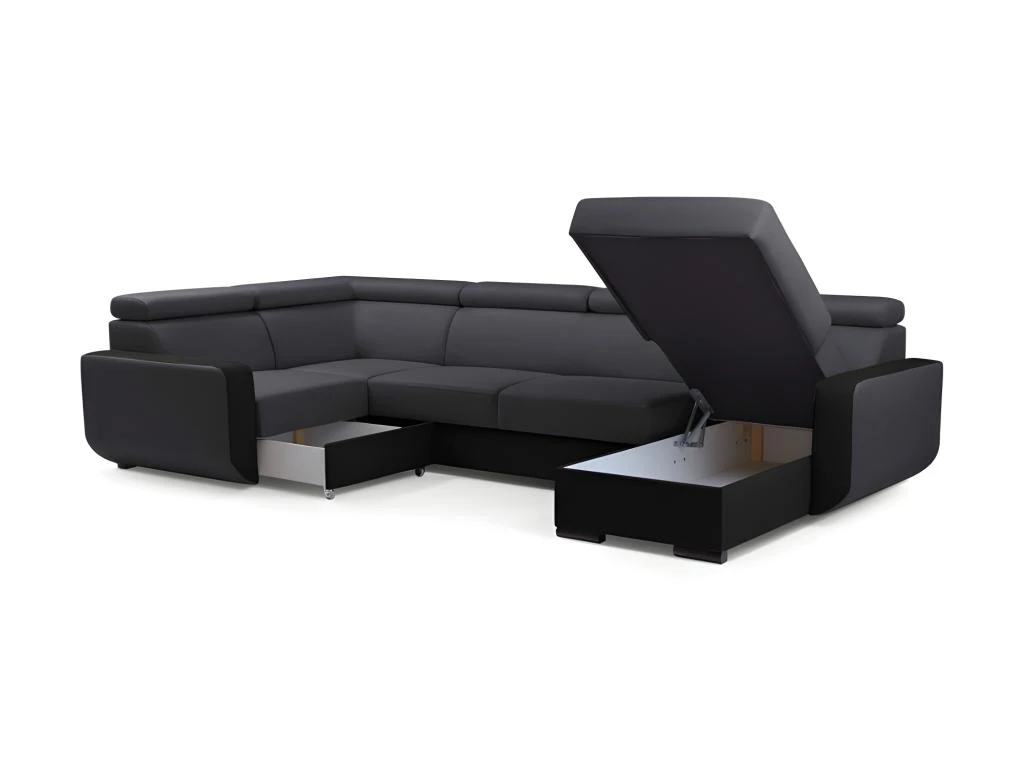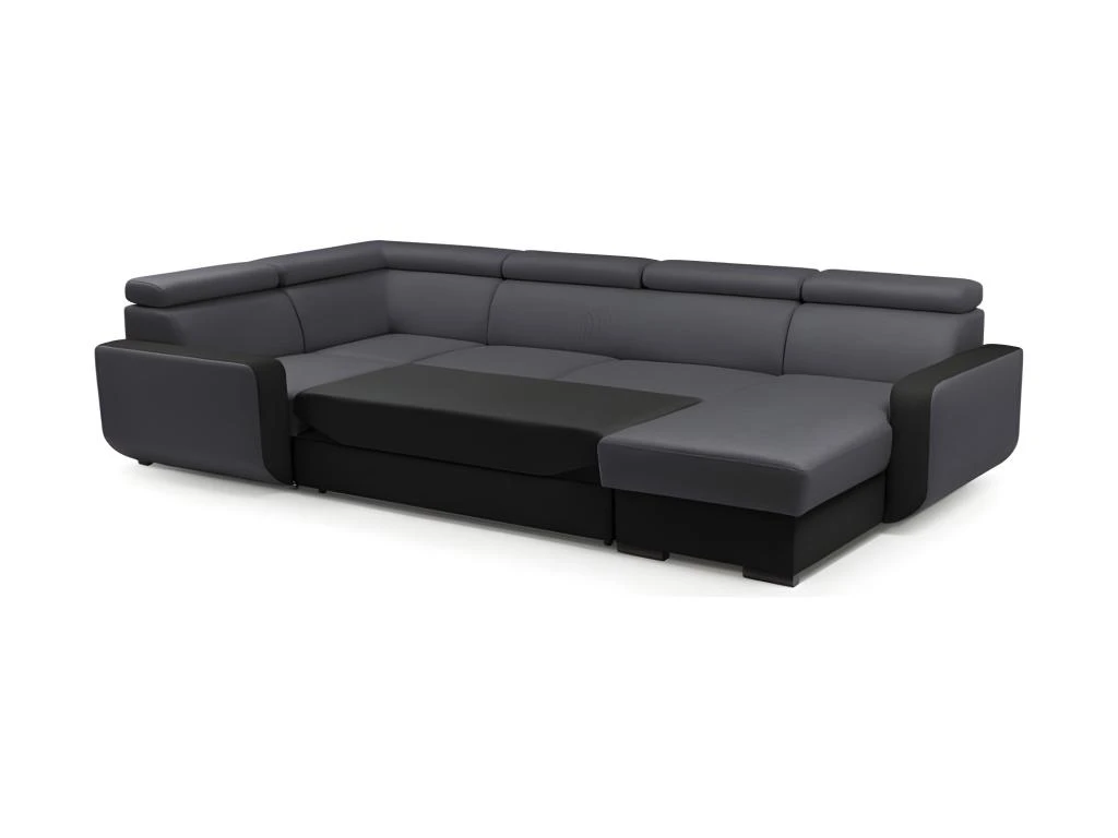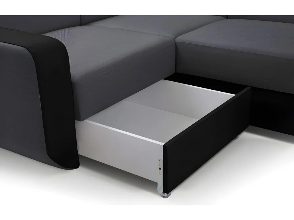 Ce canapé est convertible en lit, il dispose d’un coffre de rangement sous sa méridienne et d’un tiroir.