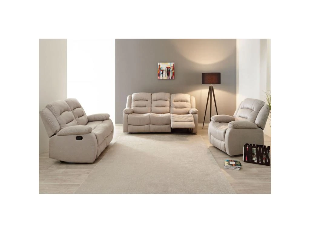 Canapé relax manuel au confort exceptionnel assuré par une garniture mousse 28 Kg/M3 intégrant des ressorts et suspendue par des sangles élastiques.