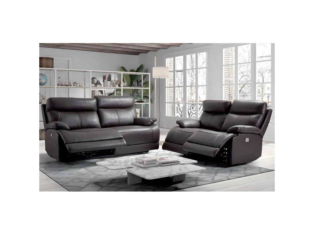 Un canapé au look contemporain en cuir marron foncé avec des surpiqures orange. Possède une fonction relax électrique pour un confort optimal une fois rentré chez vous.
