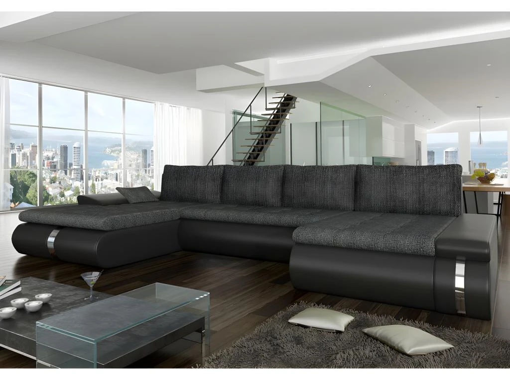 Vous avez un grand salon et vous souhaitez l’aménager ? Optez pour le canapé panoramique convertible AZELMA et le mur TV BLAKE. Grâce à son design ultra moderne et à ses multiples rangements, le mur TV saura s’adapter dans tous les décors et épousera parfaitement les formes de votre télévision. Convertible, panoramique et composé de rangements, le canapé AZELMA sera la pièce maitresse de votre salon. Installez-vous confortablement dans votre grand canapé panoramique convertible et profitez de longues soirées en ayant l’impression d’être au cinéma.