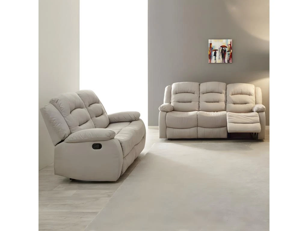Canapés : Carcasse en bois massif et en panneaux de particules. Garnissage assise en mousse de polyuréthane sur ressorts de densité 28kg/m3. Suspension sangles élastiques. Garnissage dos et accoudoirs en fibres de polyester. Revêtement canapé en tissu beige.
